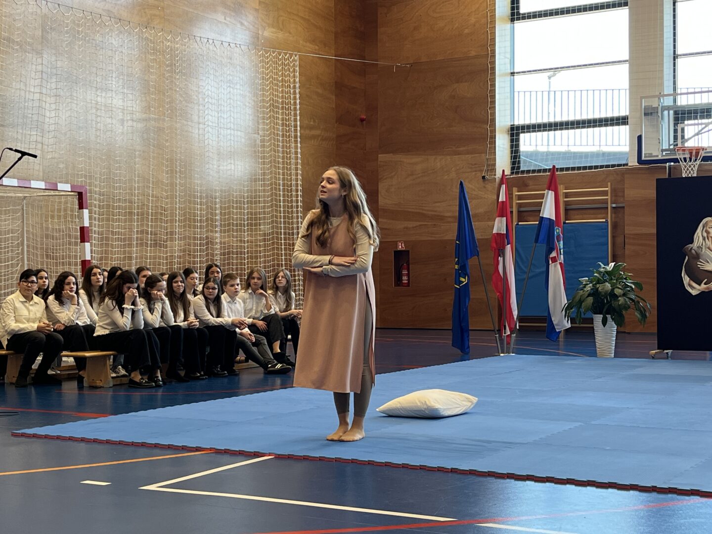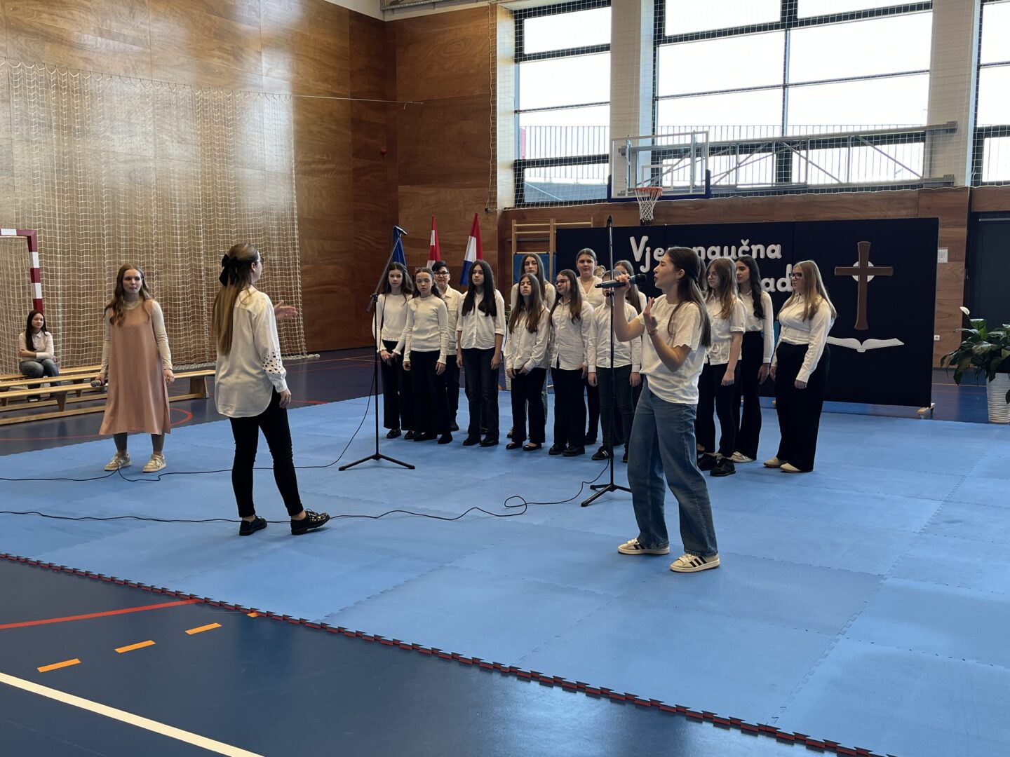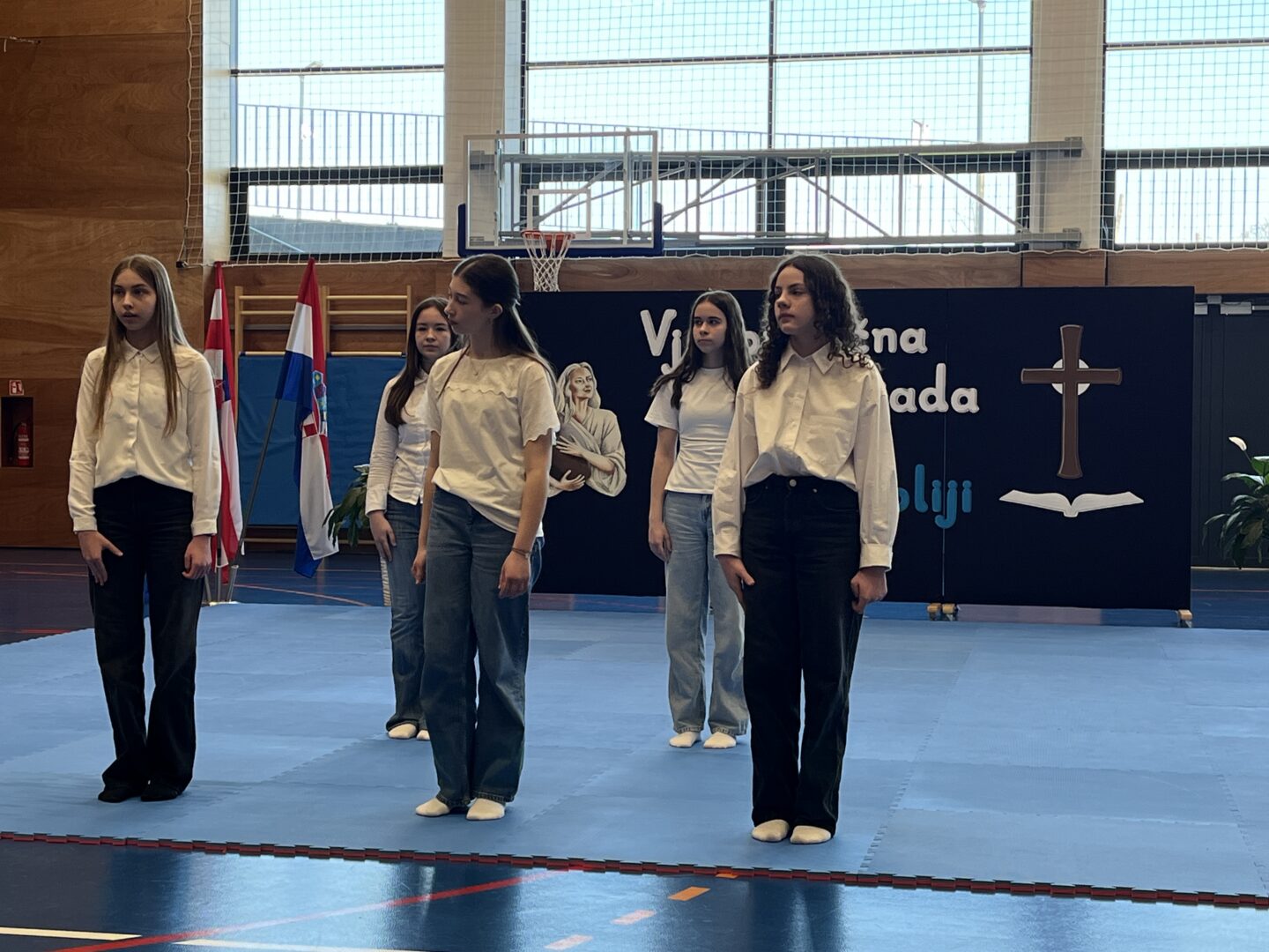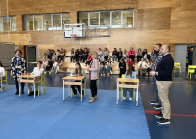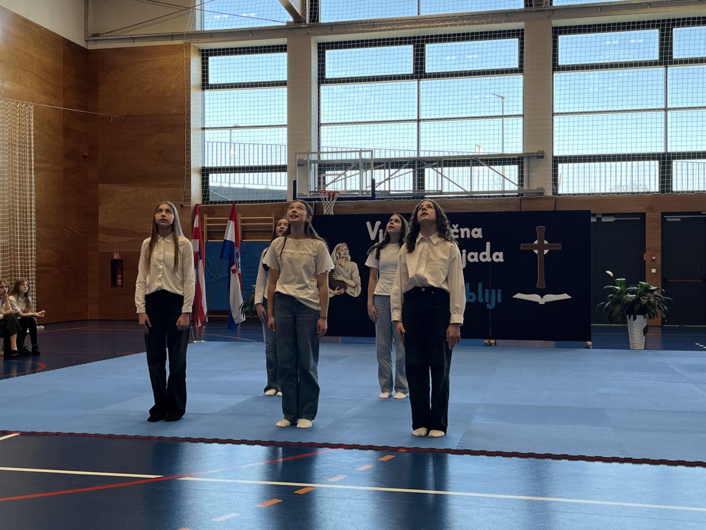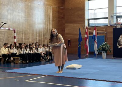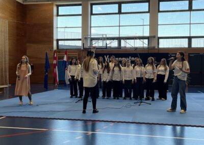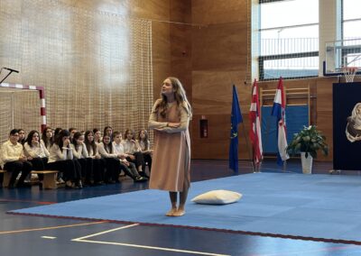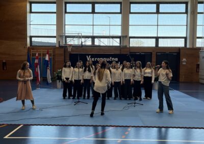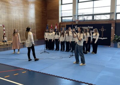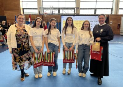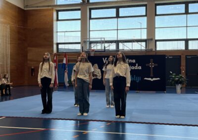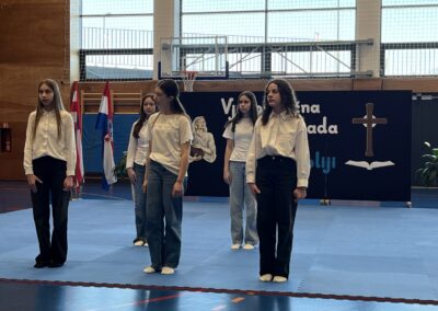 Program za natjecatelje, koji su vodile Gita Šantek i Vanessa Patrčević, protekao je u svečanom i nadahnutom ozračju. Pripremili su ga članovi našega Pjevačkog zbora koji su izveli himnu i pjesmu „O, happy day“, dok je Franka Barulek dojmljivo izvela monolog „Srna“. U umjetničkome dijelu programa sudjelovale su i Jana Kreš, Ana Šestak, Hana Mikić, Gita Ribić i Emma Cikač koje su izvele recital „U tišini snijega“. Učenice su za nastup pripremale učiteljice Jelena Keretić, Sunčana Lelkić i Maja Priher. Uslijedio je prigodni govor ravnateljice Škole Anđelke Rihtarić, a potom je molitvu predvodio predstojnik Katehetskoga ureda, prečasni Damjan Koren, čime je susret dodatno obogaćen duhovnom dimenzijom.
