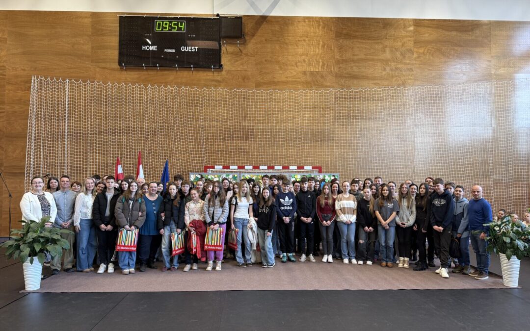 Sudionike i njihove mentore dočekali su i pozdravili učenici naše škole koji su im, pod vodstvom svojih učitelja, pripremili prigodan i vrlo svečan program u sportskoj dvorani. Svi sudionici, njihovi mentori te članovi županijskoga povjerenstva dobili su prigodne poklone koje su im pripremile školska Učenička zadruga „Ilek“ te Školska knjiga. Nakon zajedničkog fotografiranja učenici su prionuli na rješavanje pisanih zadaća koje su morali riješiti u 90 minuta.